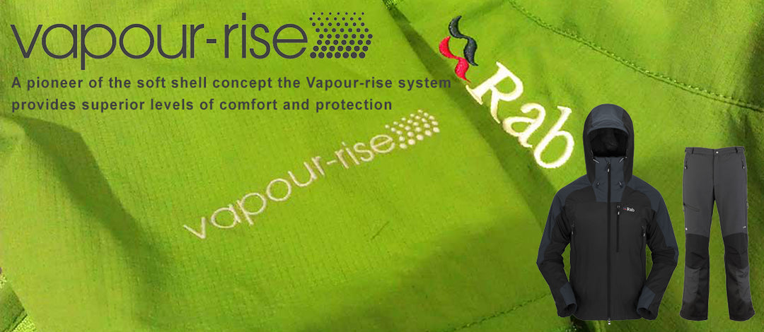 Vapour-rise™ A pioneer of the soft shell concept the Rab® Vapour-rise system provides superior levels of comfort and protection. Vapour-rise balances wicking, warmth and wind resistance to maintain a comfortable micro-climate within the garment through a wide range of activity levels and weather conditions. It is best worn either next to skin, or more commonly over a wicking base layer.